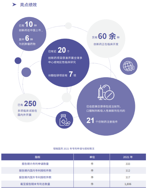 报告指出,在科技创新战略引领下,AG百家乐医药2021年累计研发投入62.03亿元,比上年增长24.34%,研发投入占销售收入比重达到23.95%,再创历史新高。以此为支撑,2021年公司有3款创新药获批上市,已上市创新药总量增至10款,其中6款为抗肿瘤药物。同时还有60余种创新药正在临床开发,250多项临床试验在国内外开展,其中近20个创新药项目获准开展全球多中心或地区性临床研究。在创新药研发上,AG百家乐医药已基本形成了上市一批、临床一批、开发一批的良性循环。
